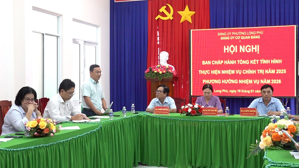 Sáng ngày 16/01/2026, Ban Thường vụ Đảng ủy Các cơ quan Đảng phường Long Phú tổ chức Hội nghị Ban Chấp hành Đảng bộ (mở rộng) để tổng kết tình hình thực hiện nhiệm vụ chính trị năm 2025 và đề ra phương hướng nhiệm vụ năm 2026. Đồng chí Trần Thị Hòa Bình, Phó Bí thư Thường trực Đảng ủy - Bí thư Đảng ủy Các cơ quan Đảng phường Long Phú chủ trì hội nghị. Tham dự còn có các đồng chí Nguyễn Thanh Phong, Phó Chủ tịch HĐND phường - Phó Bí thư Đảng ủy Các cơ quan Đảng ; đồng chí Nguyễn Thanh Tuấn, Chủ tịch Uỷ Ban MTTQ VN phường - UV BTV Đảng ủy Các cơ quan Đảng.