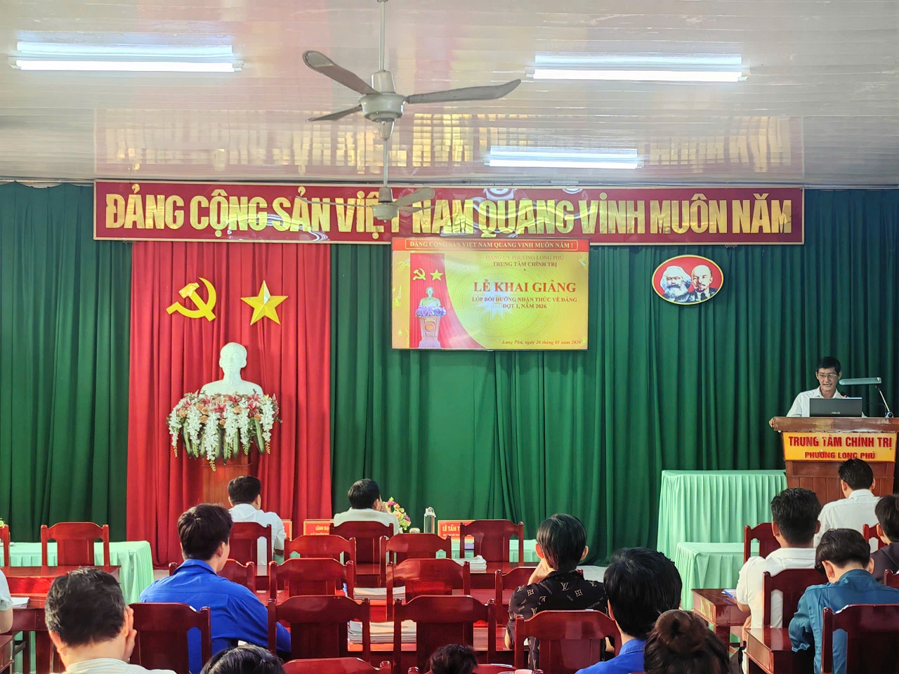 Sáng ngày 26/01/2026, Trung tâm Chính trị phường Long Phú phối hợp với Đảng ủy, Ban Xây dựng Đảng các xã phường trong khu vực tổ chức Lễ khai giảng lớp Bồi dưỡng nhận thức về Đảng - Đợt 1, năm 2026. Tham dự có đồng chí Lê Tấn Thành, Đảng ủy viên - GĐ Trung tâm Chính trị phường; cùng lãnh đạo Ban Xây dựng Đảng phường Tân Châu và xã Châu Phong.