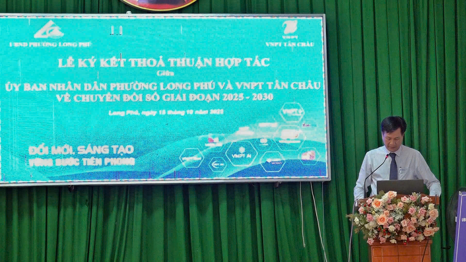 Chiều ngày 15/10/2025, UBND phường Long Phú phối hợp với VNPT Tân Châu tổ chức Lễ ký kết thỏa thuận hợp tác chuyển đổi số giai đoạn 2025 – 2030. Tham dự buổi lễ có Phó Chủ tịch UBND phường kiêm Giám đốc Trung tâm phục vụ hành chính công Uông Trung Hưng cùng đại diện lãnh đạo VNPT tỉnh An Giang và khu vực Tân Châu.